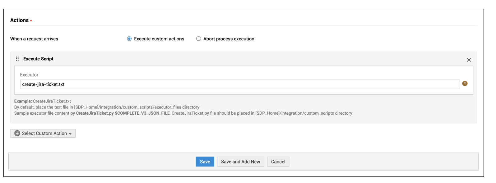 将文件保存为 create-jira-ticket.txt,并放在 [SDP_HOME]/integration/custom_scripts/executor_files 目录下。