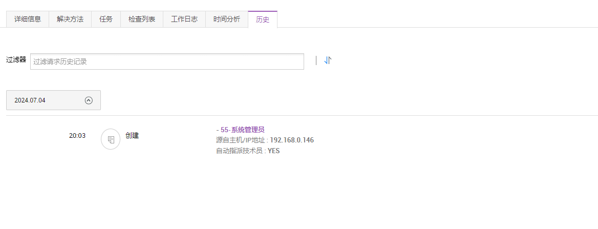 (C) 历史记录: 从事件创建到关闭,事件请求的每一步都会自动记录日期和时间。可在特定请求的历史选项卡中查看事件活动的完整记录。