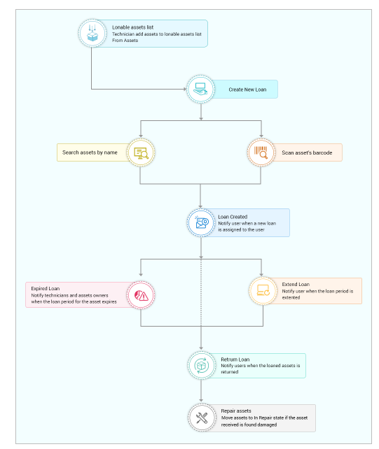 资产租出现称为资产租赁。 资产租赁通过增强的功能得到增强,该功能可帮助技术人员借出资产并以系统的方式对其进行管理。 此功能提供下面列出的功能。