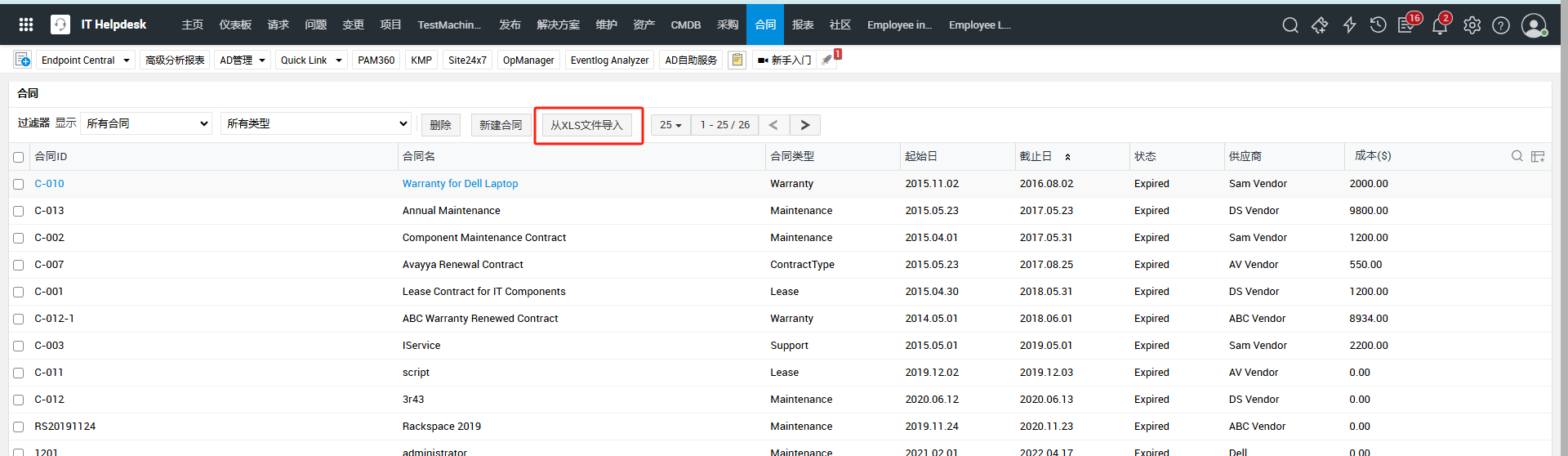 ServiceDesk Plus 中的 “从 XLS 导入 ”选项允许您从其他应用程序导入合同。