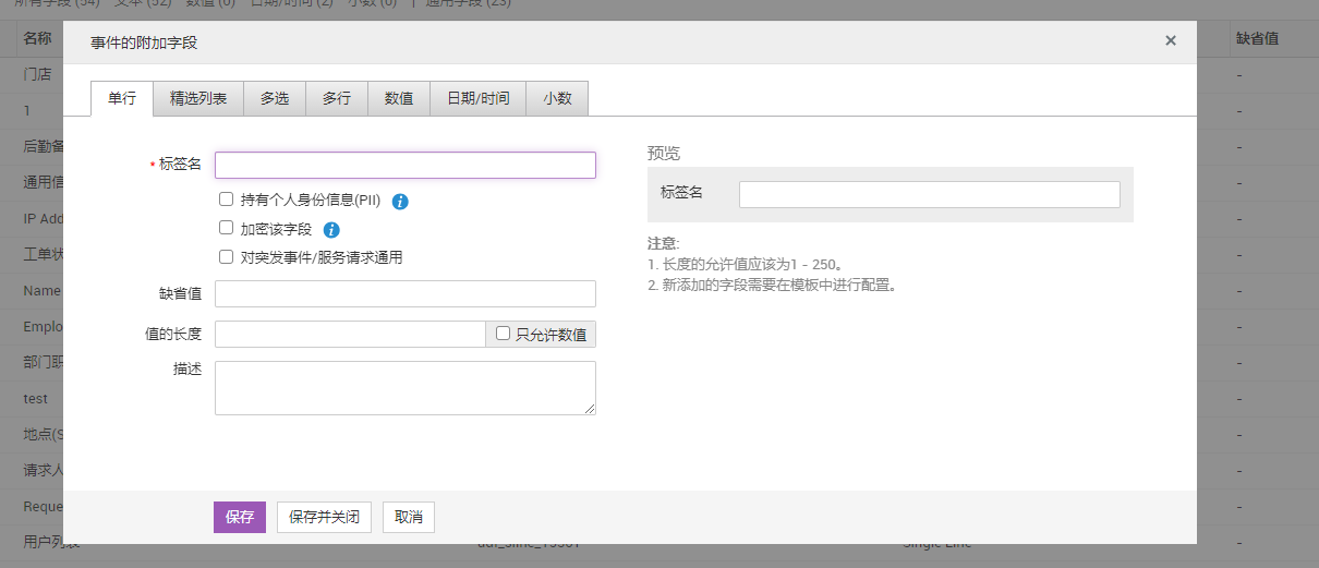 提供字段名称和描述。字段属性因所选字段类型而异。