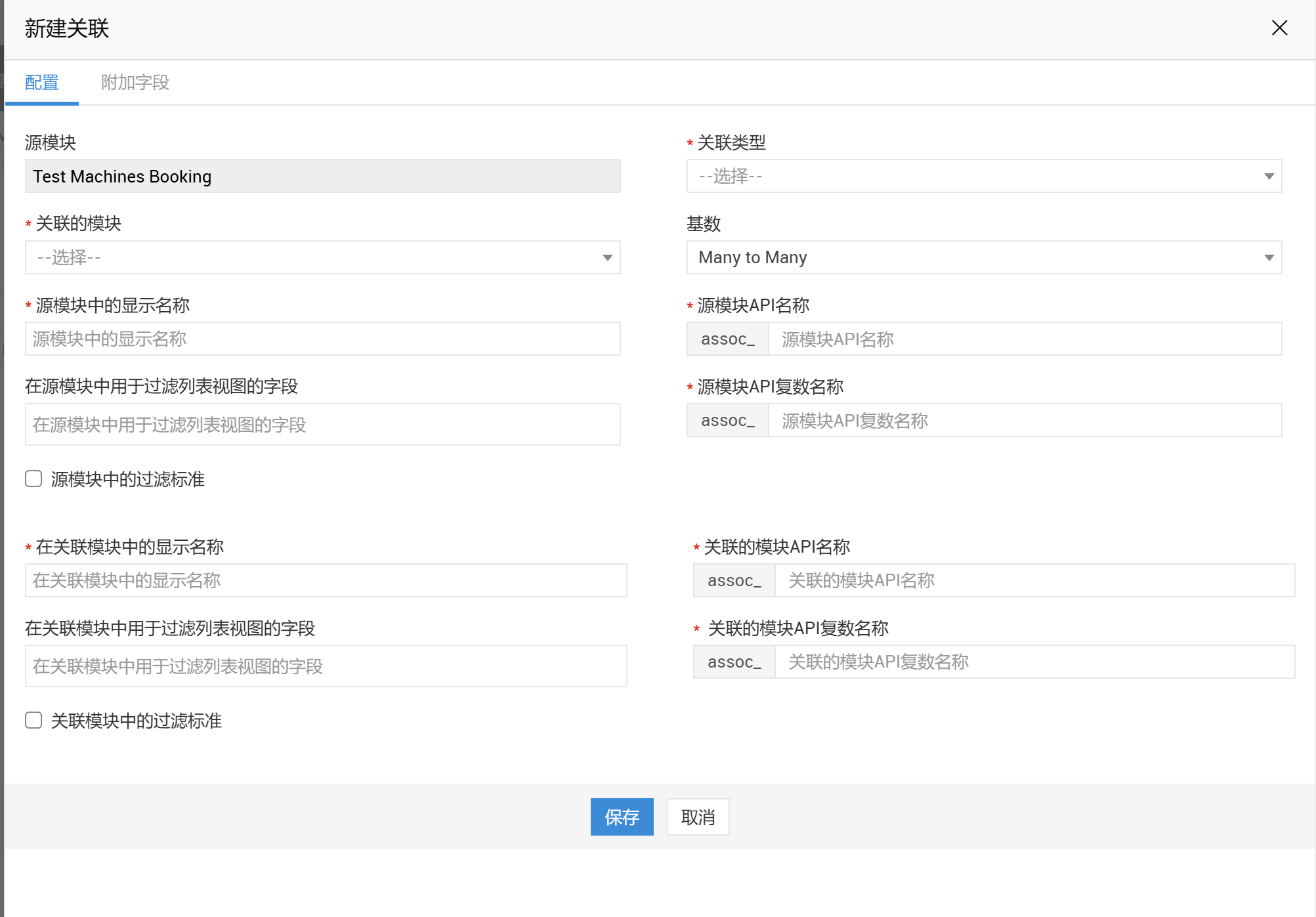 关联模块 API 名称和源模块 API 复数名称 | 以 snake_case 指定相关模块的 API 名称。 默认情况下,源模块 API 名称以 assoc_ 作为前缀。 API 名称不可编辑。 |