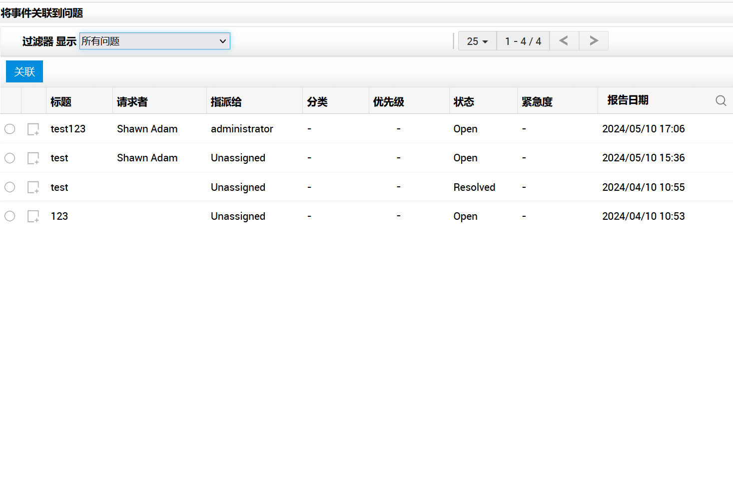 您可以选择为请求添加、关联、查看和分离问题。可以将事件(请求)中出现的类似问题关联起来,以便跟踪同一请求中出现的问题。您还可以在请求中添加新问题或分离现有问题。在添加/关联/分离问题时,请求的审批状态不会改变。