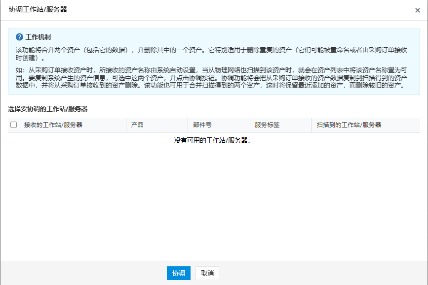 注意 | 1. 产品类型为消耗品的项目未添加到资产中,因此无法进行协调。 2. 扫描的工作站只能协调一次。 3. 不能对同一采购订单中的工作站进行协调。 |