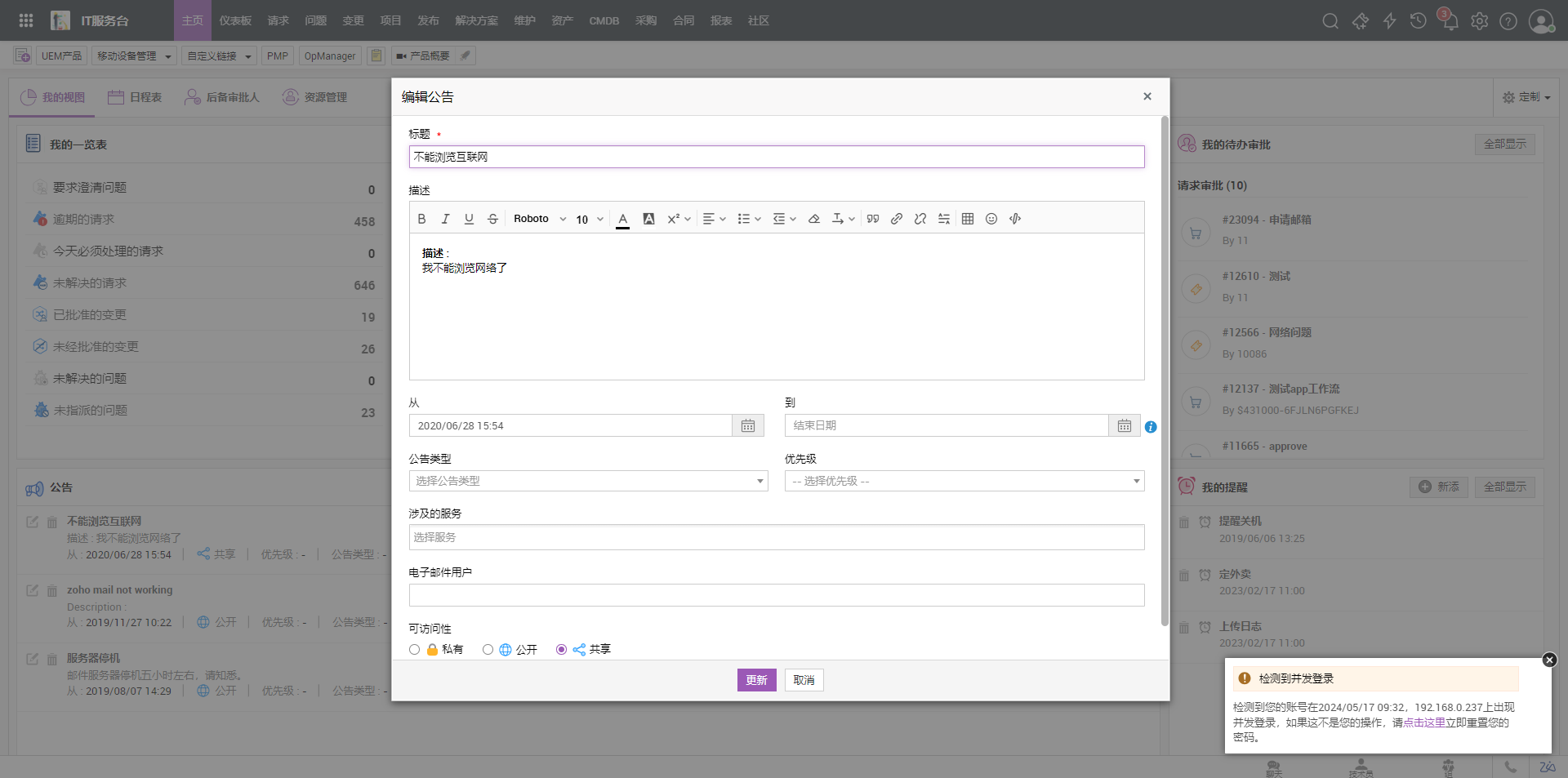 要编辑公告,请在弹出的公告详情中单击 "编辑",进行必要的变更,然后单击 "更新"。