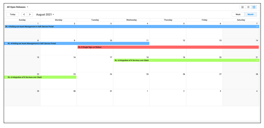 日历视图是一种自定义视图,可让您以月视图或周视图的形式,将发布请求视作若干天内的水平条。水平条的跨度基于发布请求的开始和结束时间。该视图更侧重于发布请求的时间轴。单击右上角的日历视图可切换该视图。