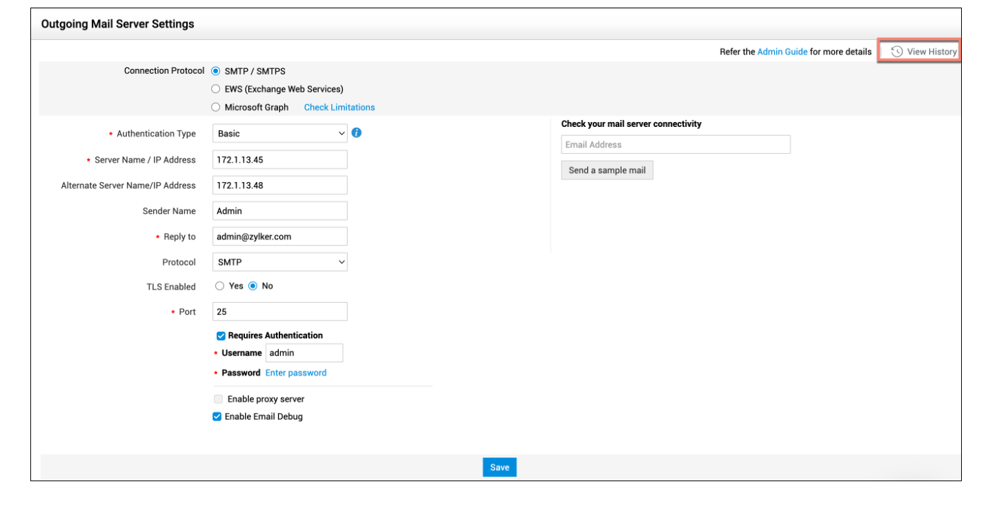 点击页面右上角的查看历史记录,跟踪对外发邮件服务器配置所做的变更。