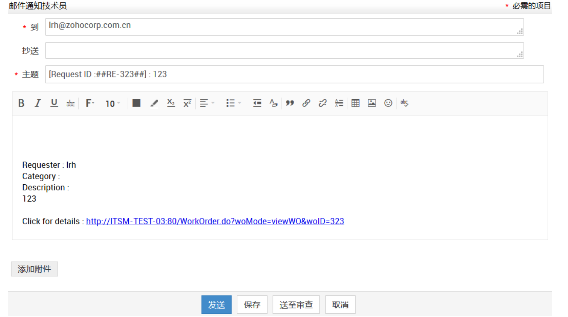 在请求明细页,点击“回复”下拉菜单并选择“短信通知技术人员”选项。系统将弹出“邮件发送给技术人员”窗口,收件人地址默认填充管理选项卡中为该技术人员配置的短信邮件ID。