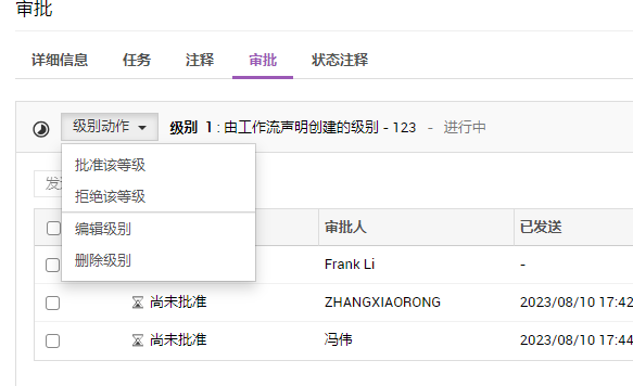 从级别动作下拉菜单中,您可以根据权限批准、拒绝、编辑或删除审批级别。
