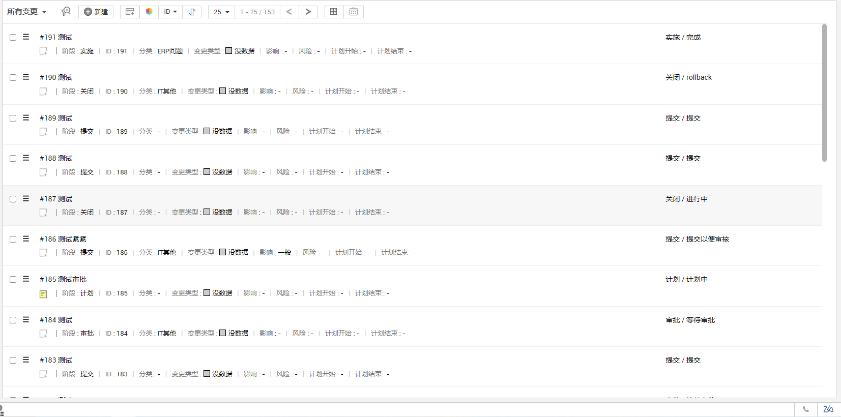 经典视图允许您以项目列表的形式查看变更,并突出显示标题和阶段。所有其他变更属性都显示在标题下面的行中。您可以使用列选择器添加或删除所需的属性。