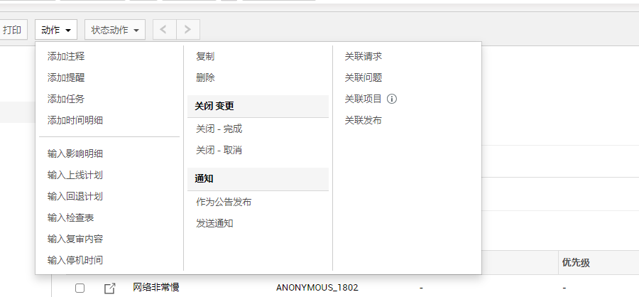 您还可以从动作菜单中将请求和问题与变更关联起来。