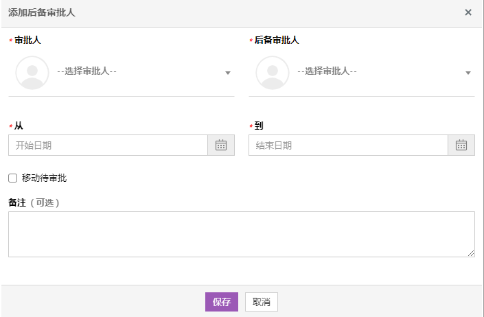 - 如果要将所有待批审批从实际审批人转移到后备审批人,请选择 "移动待批审批 "复选框。