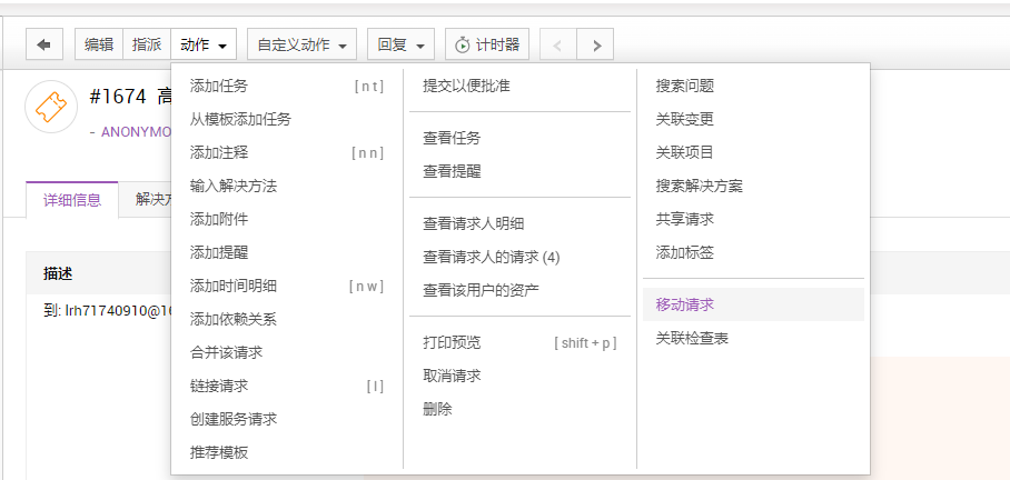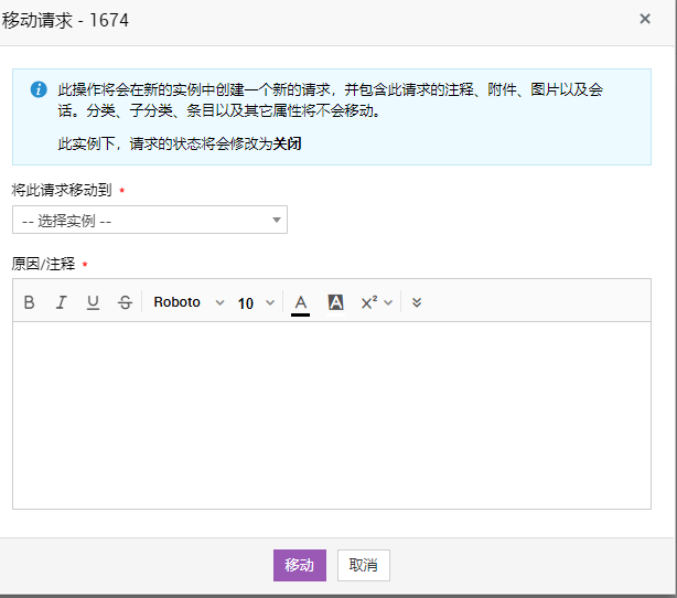 当请求者在错误的实例中提出请求时,管理员/技术人员可使用移动请求功能将这些请求放到正确的实例中。默认情况下,SDA 管理员可以使用此功能,技术人员也可以通过选择角色部分的相关选项来获得此权限。此选项仅适用于 "未结/待决 "请求。