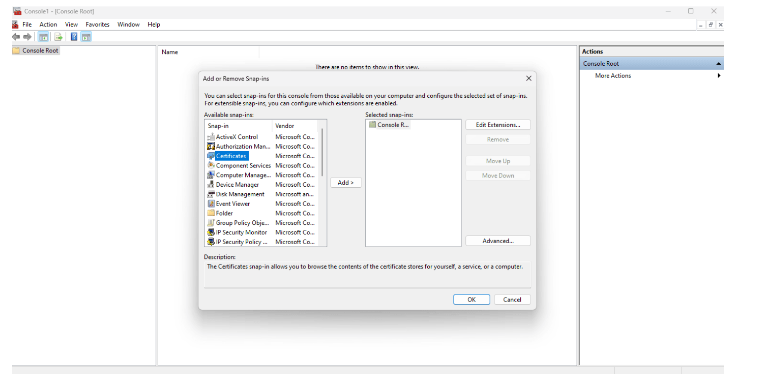 从可用快装程序中选择 “证书”,然后单击 “添加 ”将其移动到 “选定的快装程序 ”框中。