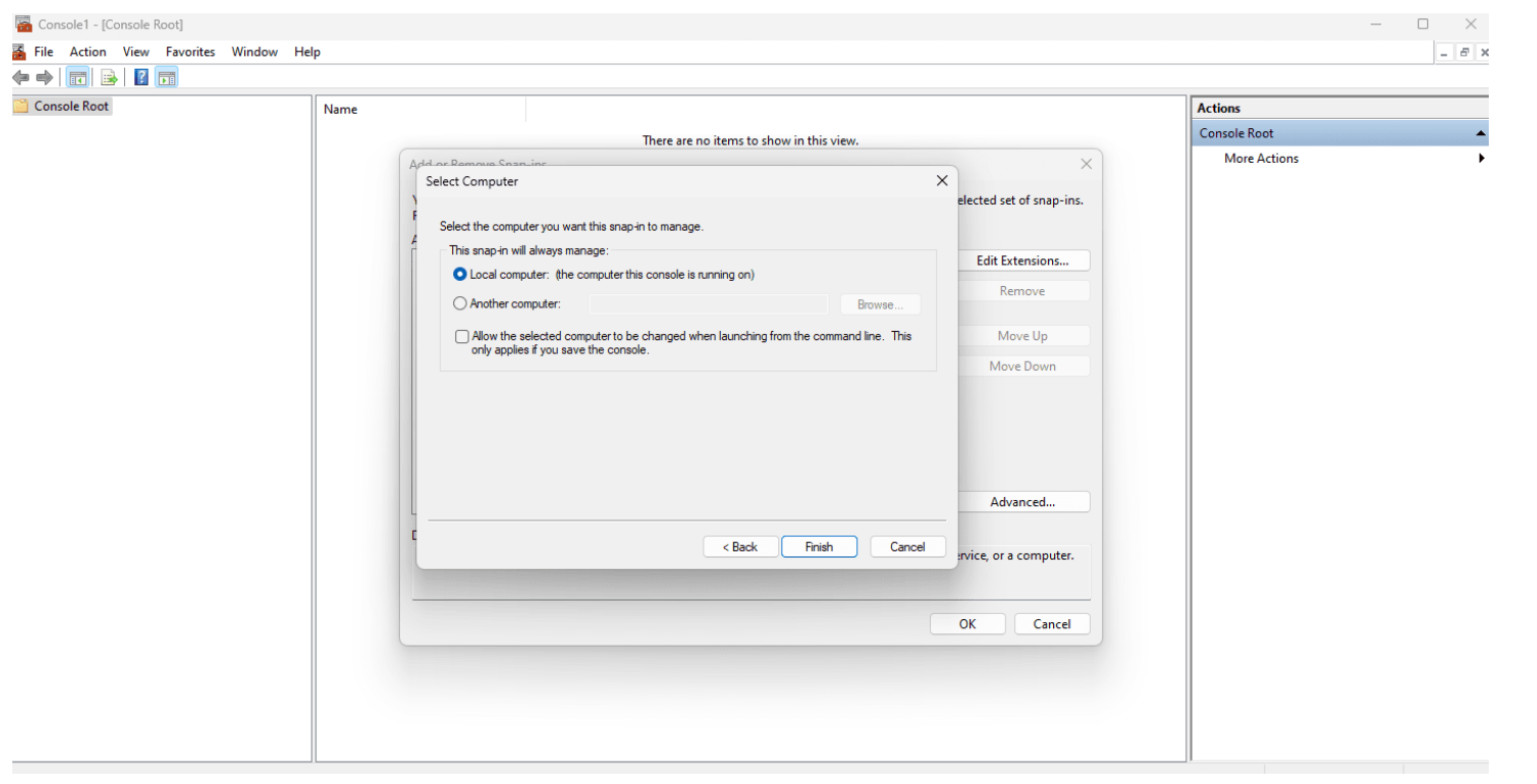 在显示的窗口中,单击 "完成",将复选框保持为默认设置(本地计算机)。