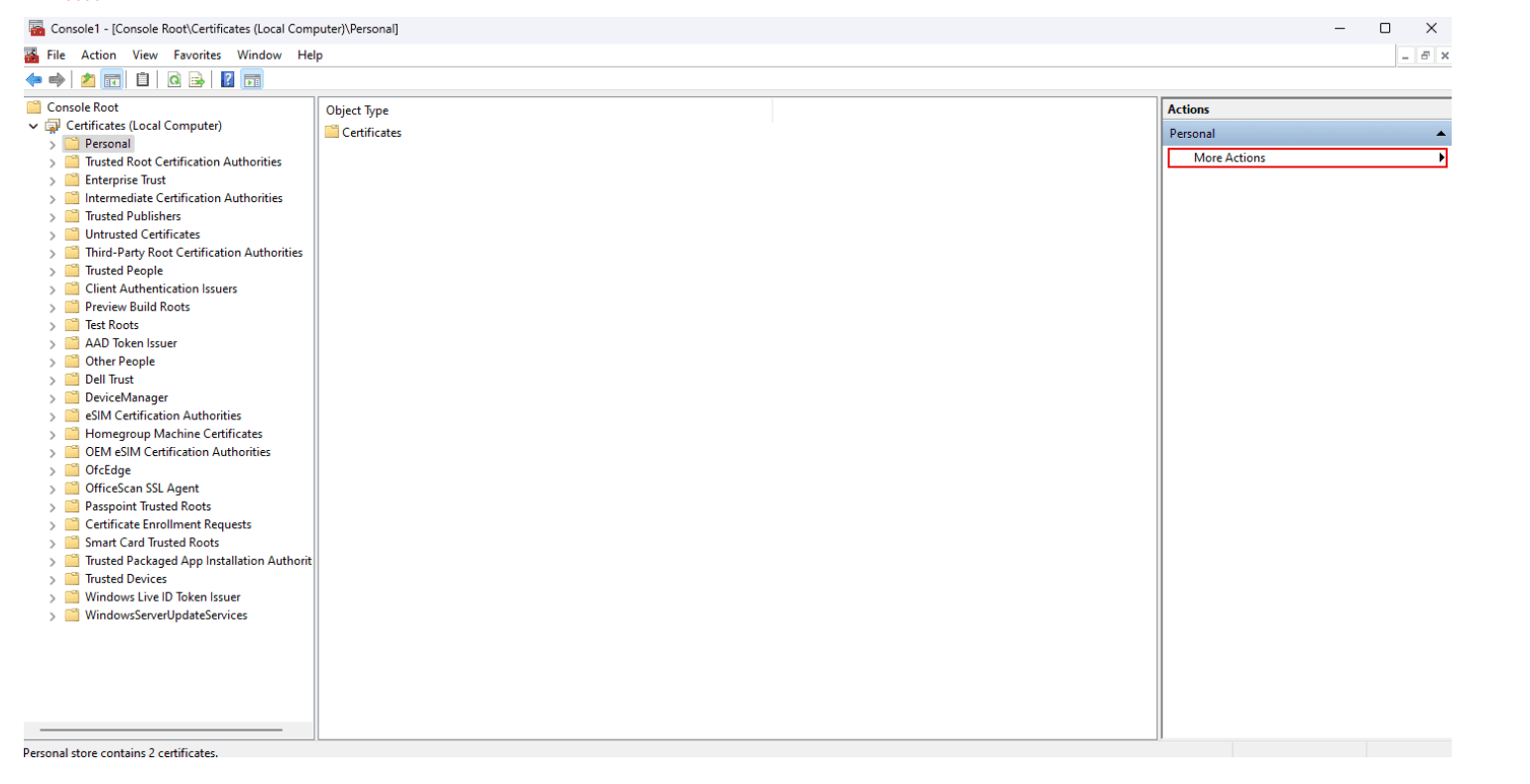 在证书 > 个人 > 证书下导入 SSL 域证书。 要导入证书,请单击操作 > 个人 > 更多操作 > 所有任务 > 导入。
