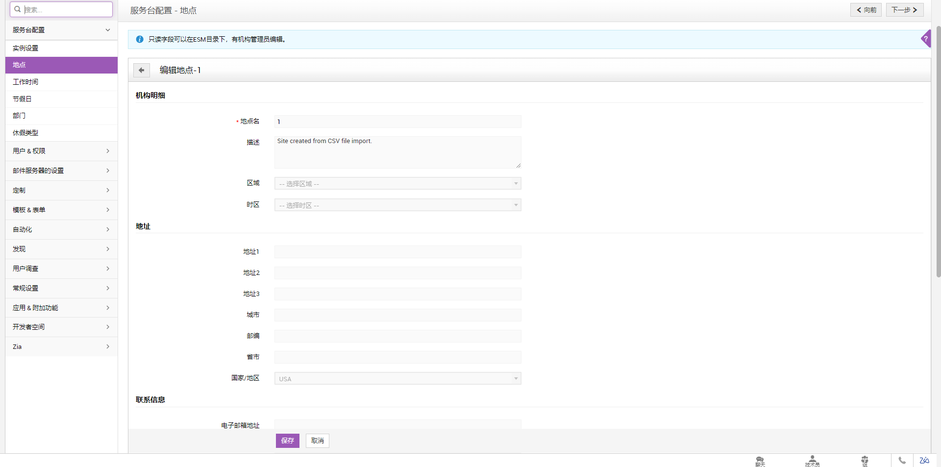 在地点下,您只能编辑 ESM 目录中已配置的地点的部分详细信息。每个地点都配置了有关运行时间、节假日、技术人员/地点关联、支持组和服务级别协议的特定设置。当您开始使用 ServiceDesk Plus 配置时,所配置的运行时间、节假日、部门和服务级别协议将被视为默认设置。因此,在添加地点时,您可以选择参考这些默认设置或为地点配置单独的设置。
