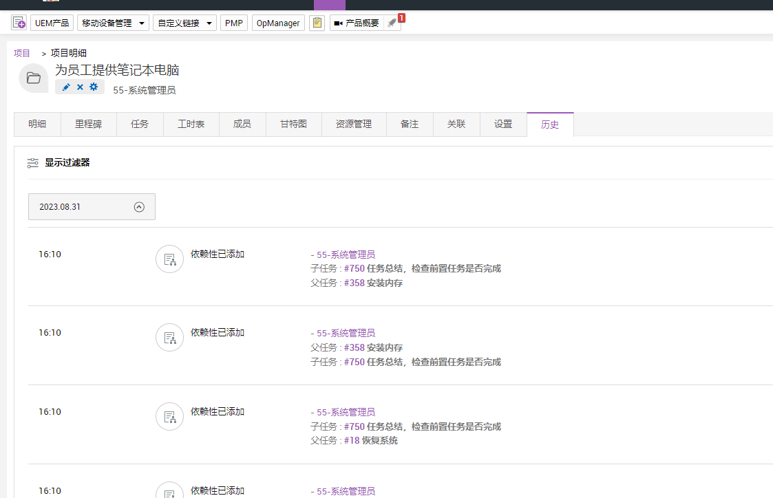 项目历史记录了对项目执行的所有操作。通过项目详细信息页面中的历史选项卡可跟踪项目的历史。各种操作按日期分组和列出。