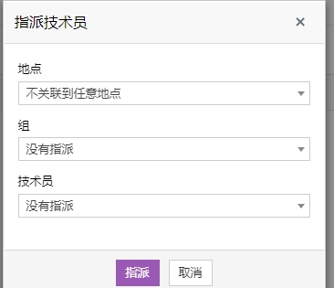 - 在打开的弹出窗口中,选择地点、组和技术员,点击指派。