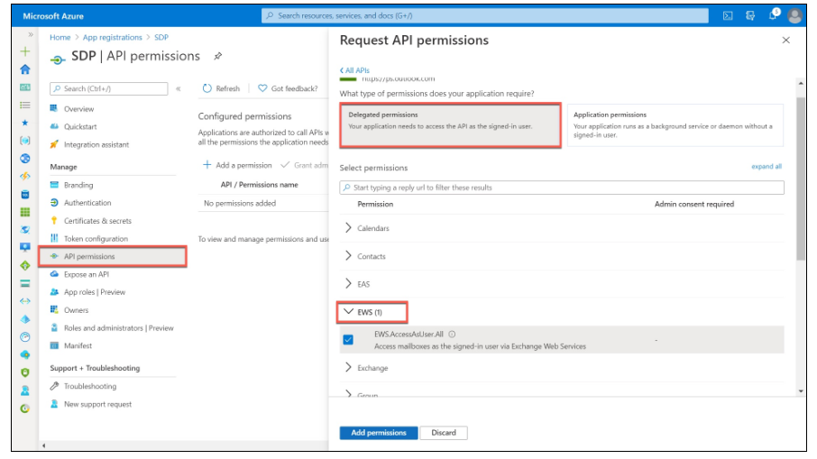 要在 ServiceDesk Plus 中配置 EWS,请单击左侧面板中的 API 权限 > 添加权限。