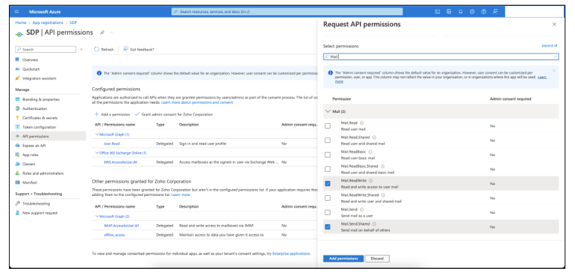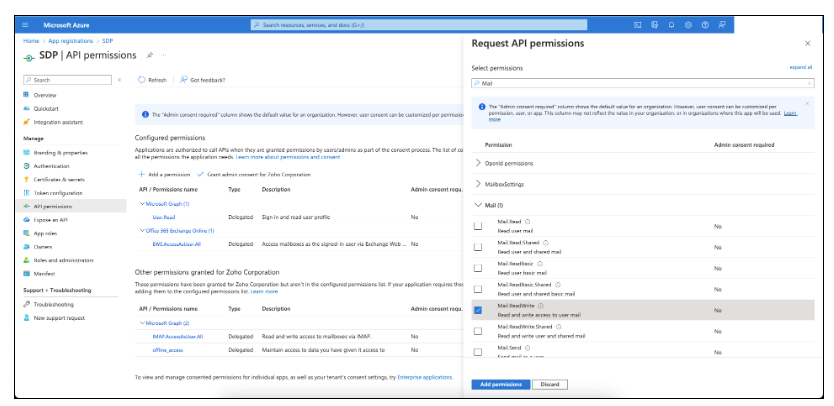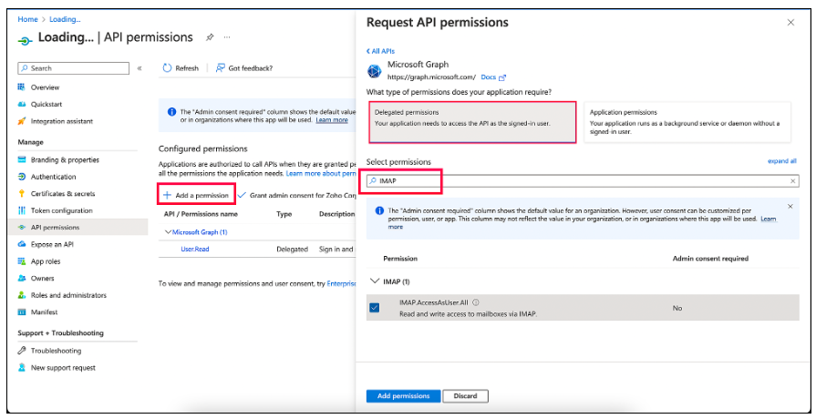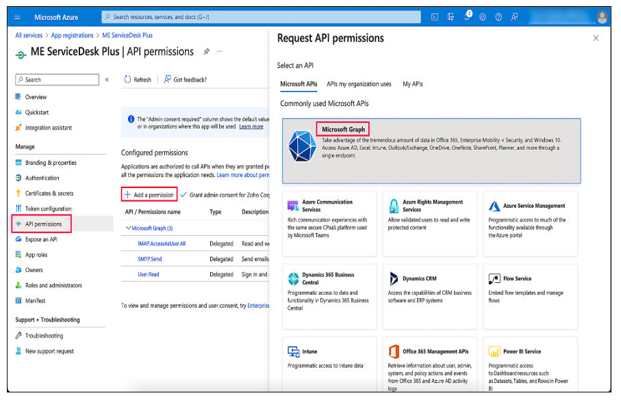 要在 ServiceDesk Plus 中配置 IMAP 或 SMTP,请单击左侧面板中的 API 权限 > 添加权限。