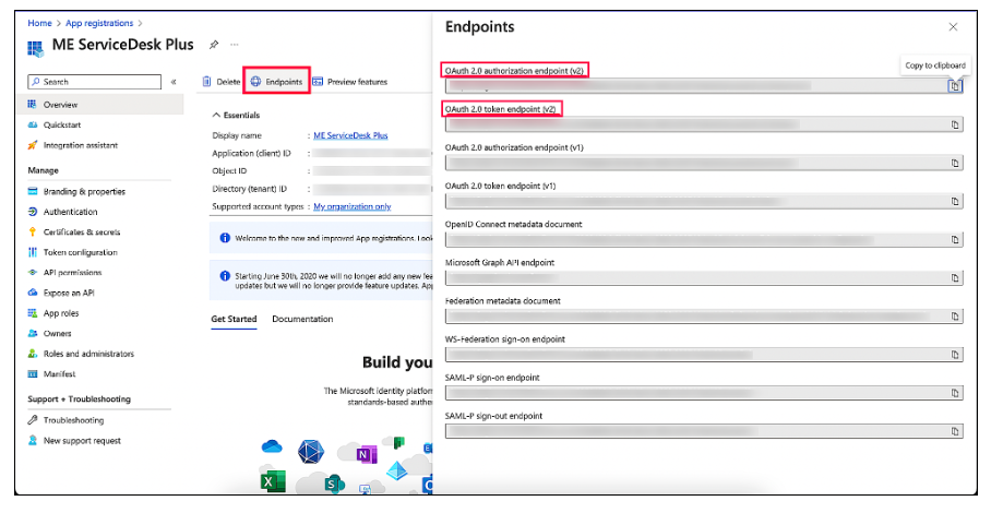 将 OAuth 2.0 授权端点 (v2) 和 OAuth 2.0 令牌端点 (v2) 分别复制到 ServiceDesk Plus 中的授权 URL 和令牌 URL。