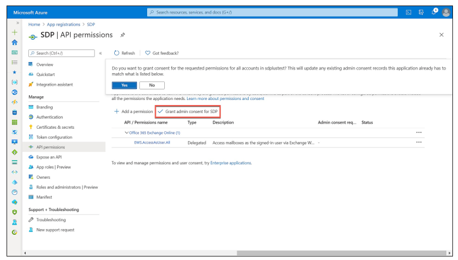 在显示的页面上,单击授予 < 应用程序名称> 的管理同意。 弹出确认窗口。 单击是继续。