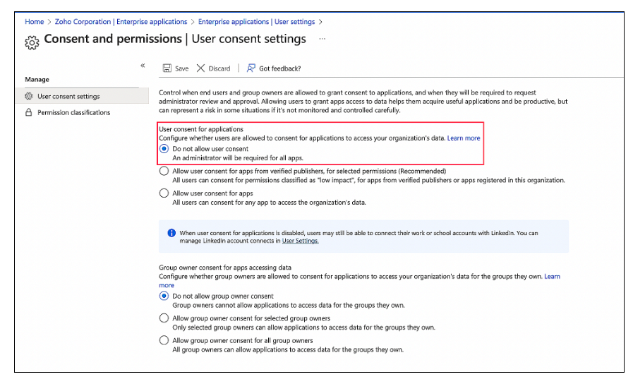 如果在 "用户同意设置 "页面中将应用程序的用户同意配置为不允许用户同意,则需要为已配置的应用程序授予管理员同意。