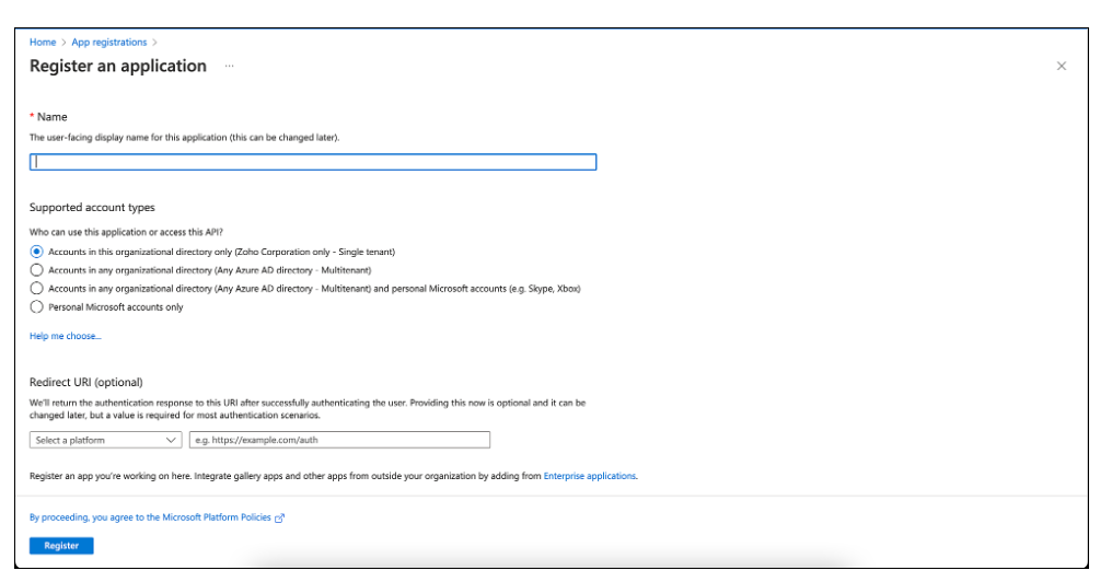 在重定向 URI 选项下,选择平台为 Web。键入 ServiceDesk Plus 的重定向 URL。您可以在管理 > 邮件服务器设置下找到重定向 URL。