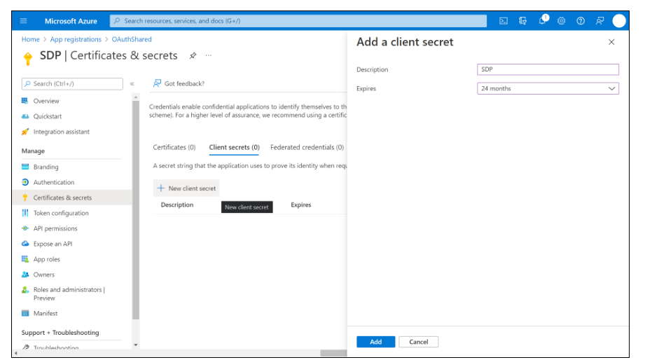 从左侧面板,单击证书和机密 > 新客户机密。