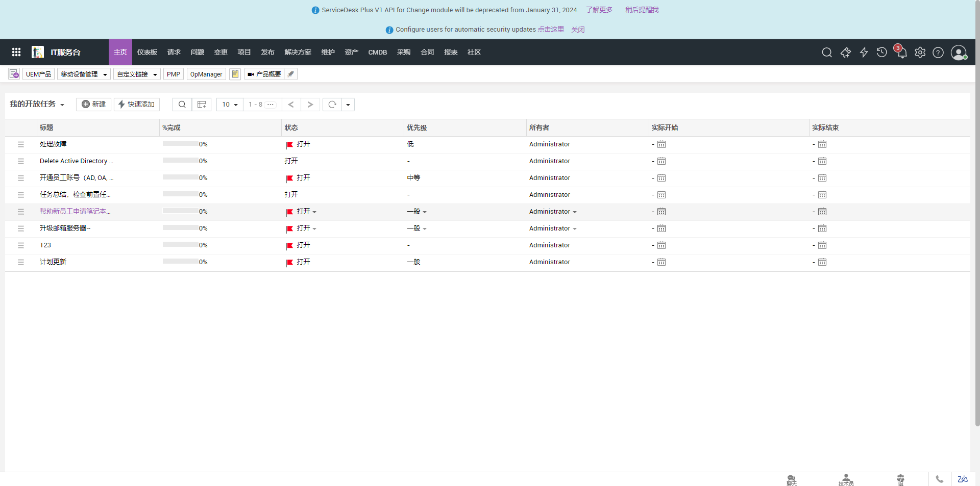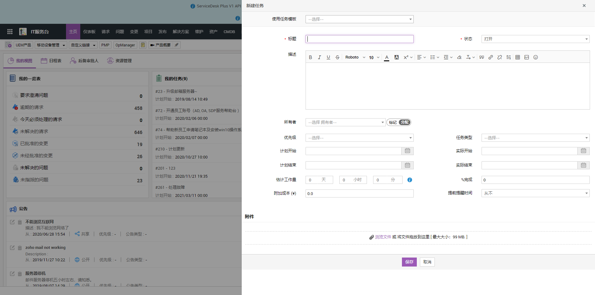 主页中我的请求摘要区块旁我的视图选项卡下的我的任务显示了分配给您的所有任务。这些任务可以由您添加,作为到期任务的个人提醒。也可以是其他技术人员分配给您的任务。
