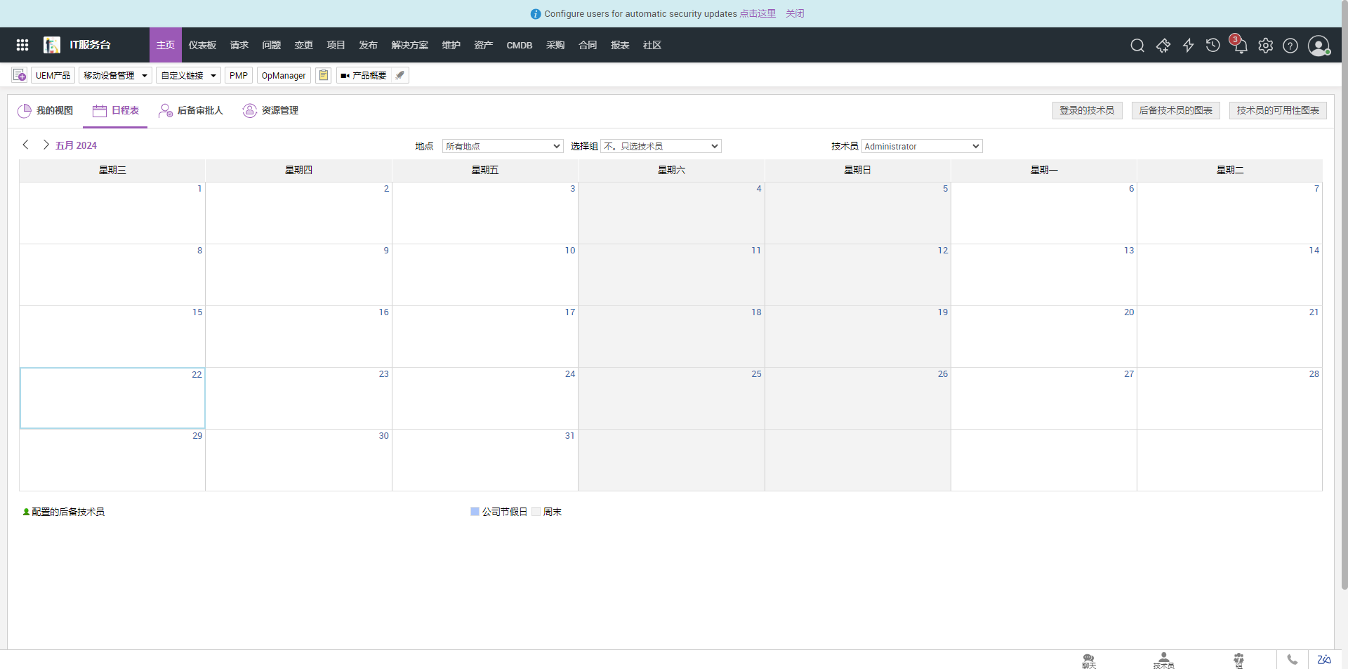 单击主页中的日程表选项卡,打开日程计划日历,显示分配给已登录技术人员的未结请求、问题、变更、任务和提醒的数量。