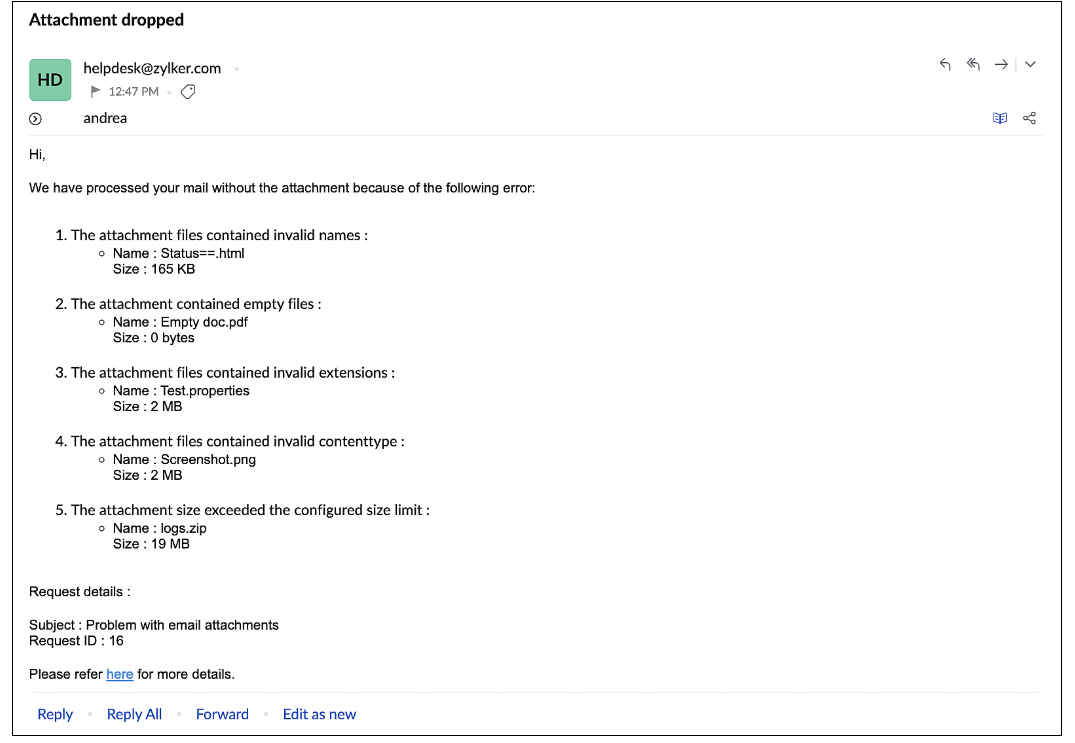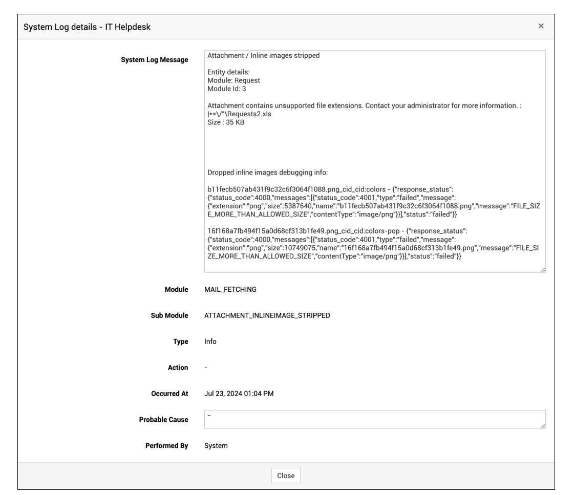 原因: ServiceDesk Plus 允许您在应用程序中允许/限制某些文件类型。如果电子邮件附件中包含受限类型的文件,附件将被丢弃。