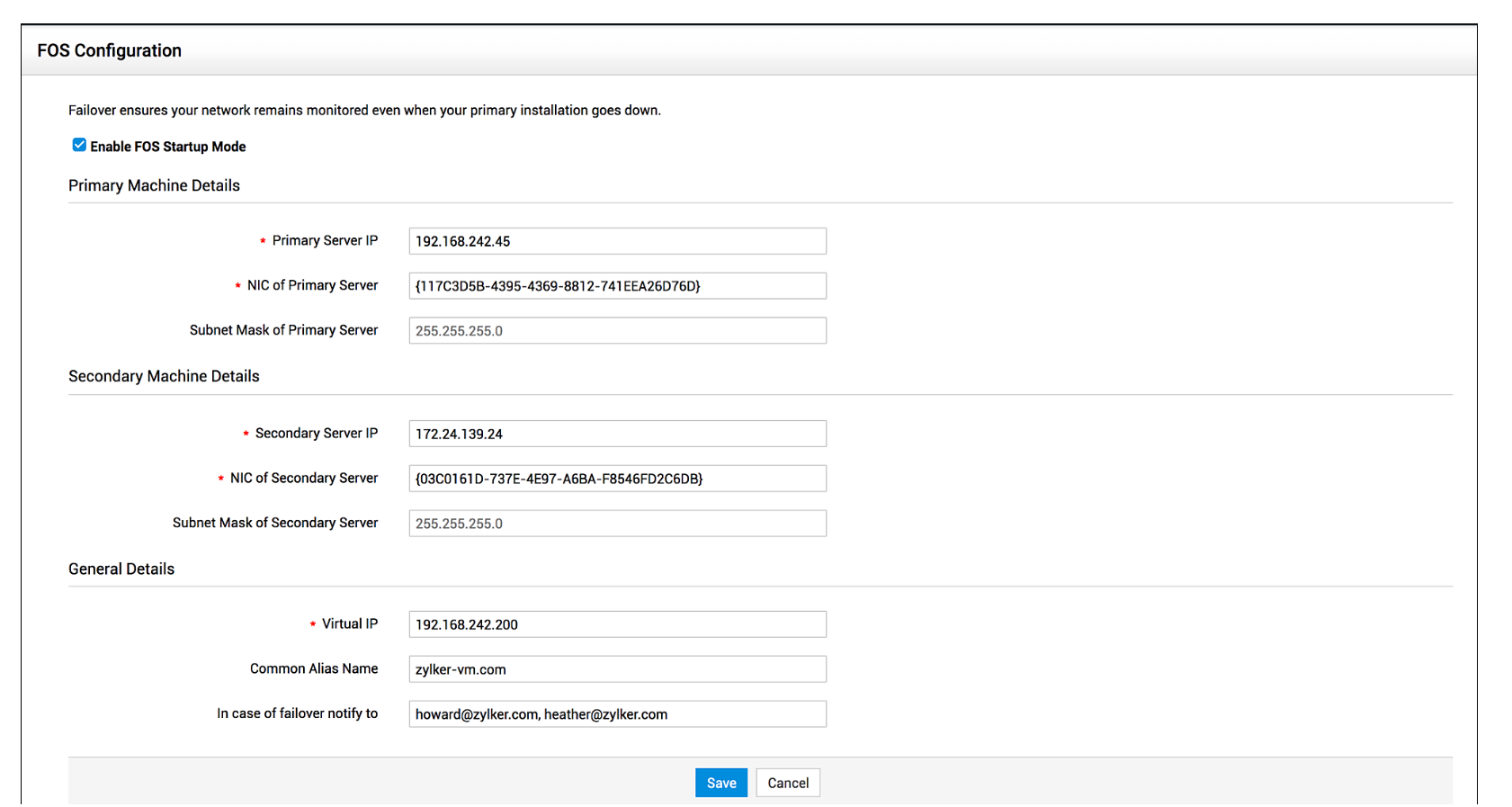 - 发生故障切换时通知 - 指定服务器发生故障时必须发送通知的电子邮件地址。有关故障切换自我监控警报、数据同步警报和辅助服务器接管警报的通知将发送到此电子邮件地址。您可以使用逗号分隔多个电子邮件地址。