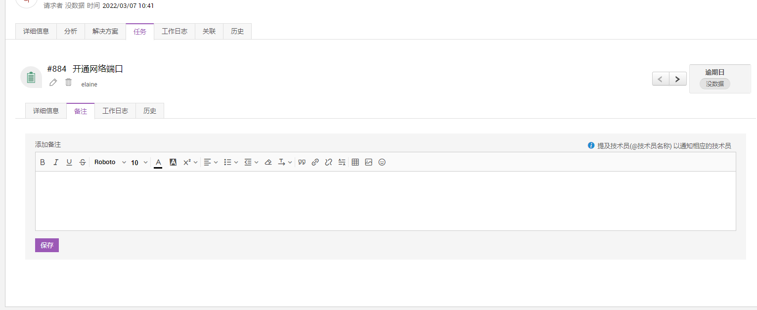 工作日志: 记录任务花费的时间。您可以添加已完成的工作、指定解决时间、成本等。