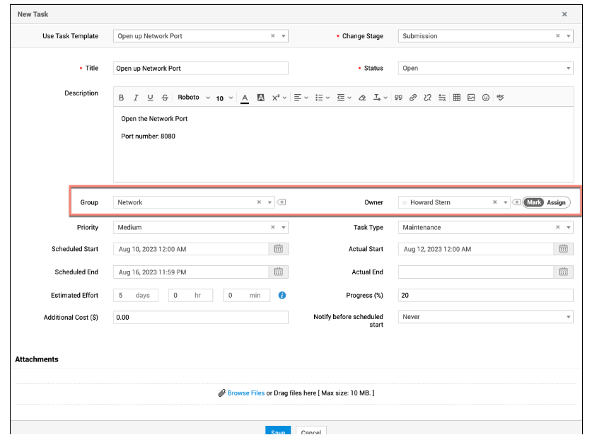 示例: 您可以提前创建任务,并将其标记给组 Network 和技术人员 Howard Stern。当需要完成任务时,只需立即将其指派给标记的小组/技术人员即可。
