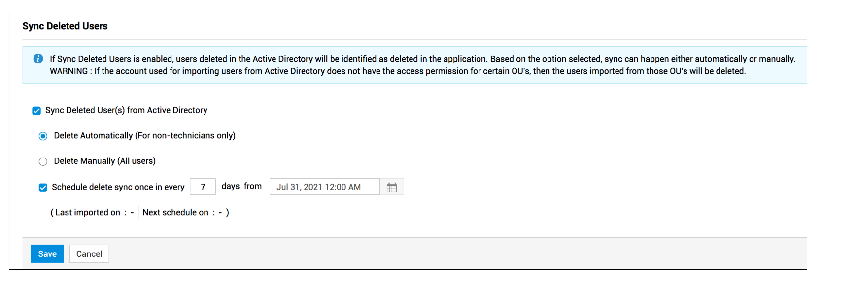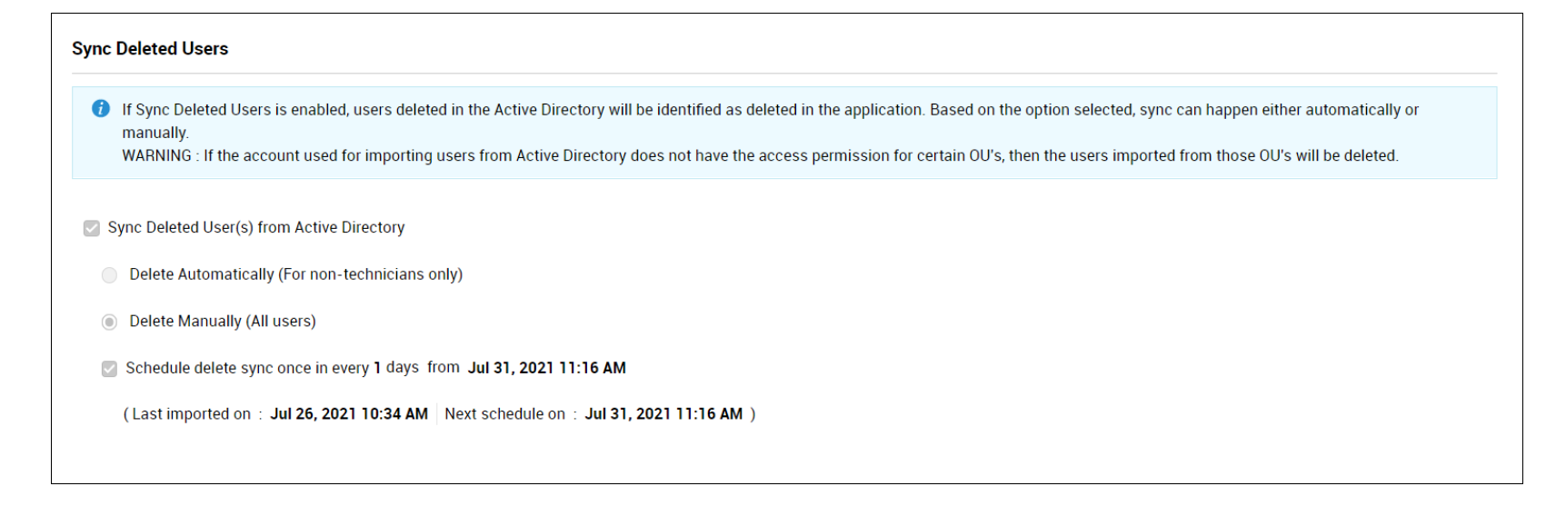如果禁用了已删除用户的同步功能,则在手动或计划导入时,AD 中已删除用户的详细信息将不会与 ServiceDesk Plus 同步。