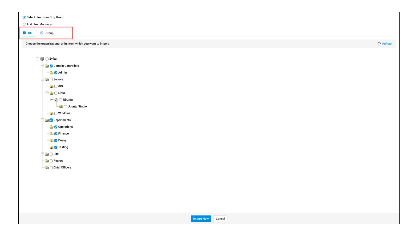 - 要选择 OU,请启用 OU 复选框。选择要从中导入用户的 OU,方法是选中其旁边的复选框。