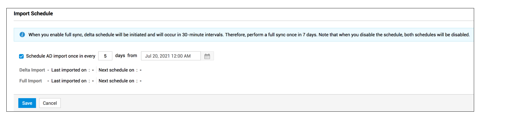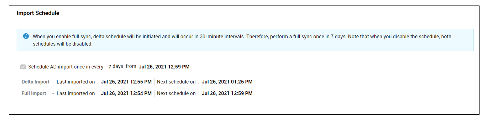 - Active Directory 中更新的用户详细信息将通过 Delta Sync 反映在 ServiceDesk Plus 中。该计划在前一个导入计划完成 30 分钟后启动。