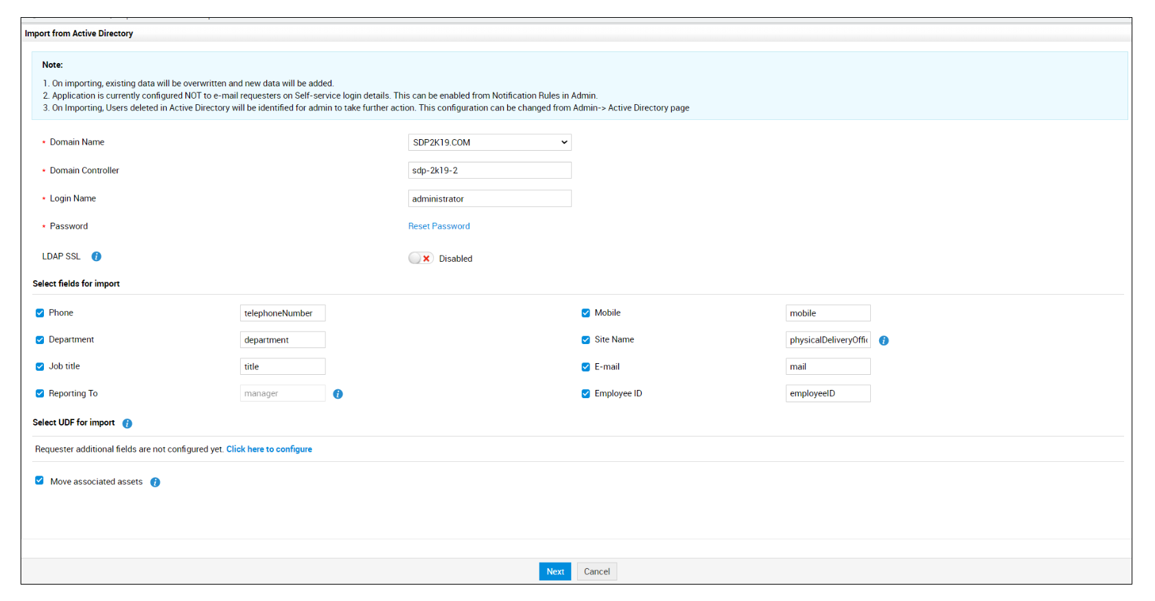 选择要导入的UDF | 如果在 ServiceDesk Plus 中配置了用户附加字段,则可以选择 UDF 字段。在所选字段旁边指定 Active Directory 中配置的字段名以映射它们。 如果尚未配置任何用户附加字段,请使用点击此处进行配置链接。您将被重定向到用户 - 附加字段页面,在这里您可以配置从 Active Directory 导入的附加字段。 数字附加字段最多可容纳 19 位数字。如果数值超过 19 位,请在文本字段中配置数值。 |