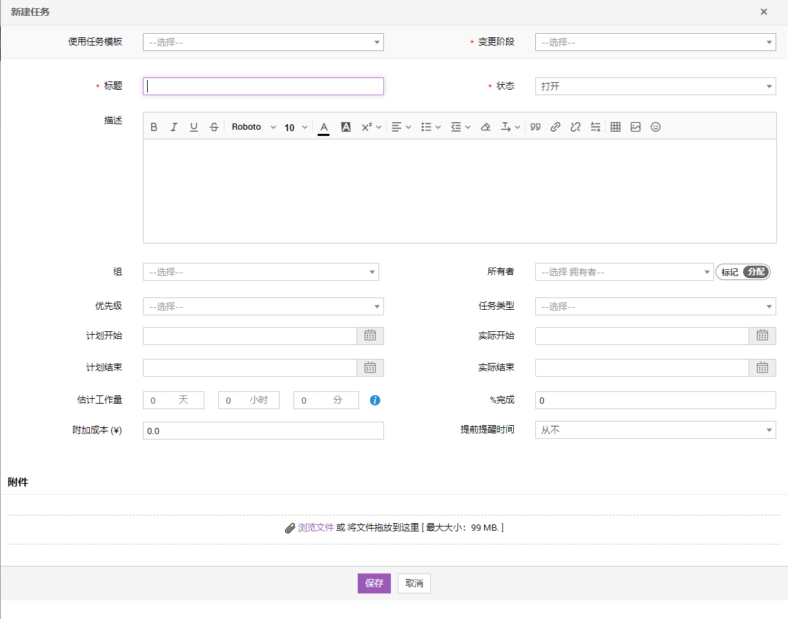 阶段* | 选择必须添加任务的变更阶段。(如果是从某个阶段添加任务,则该字段不可编辑)。 |