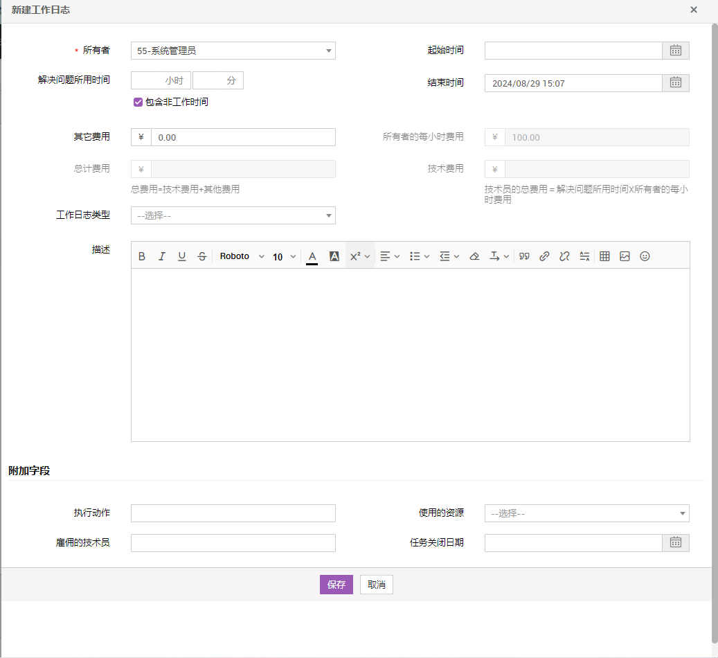 花费时间 | 根据开始和结束时间自动计算。选择包含非工作时间,以计算该工作日志开始和结束时间之间的非工作时间。 |