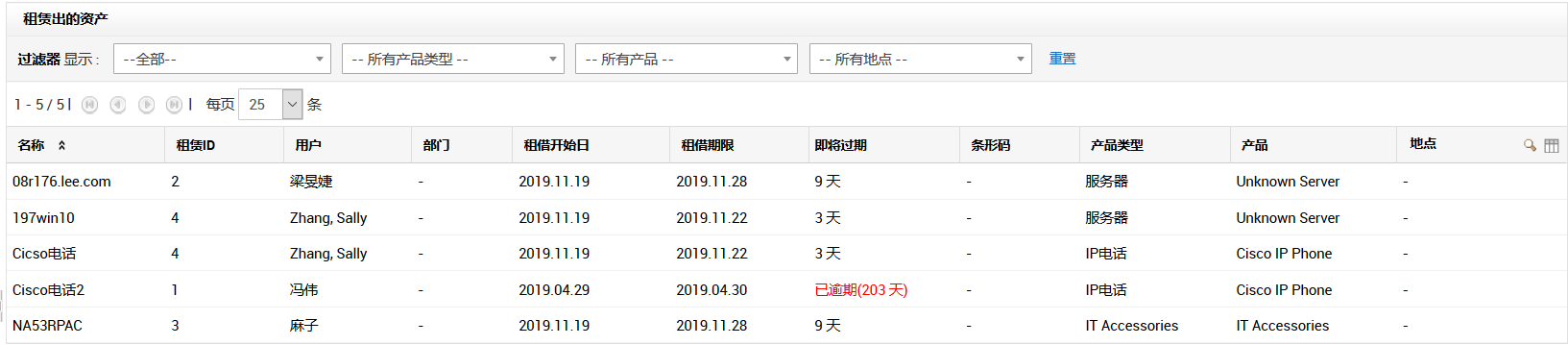 已租赁资产列表可以根据产品类型,产品和地点进行过滤。