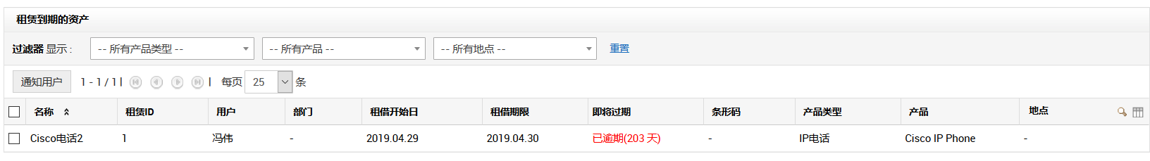 租赁到期的资产可以使用过滤条件如产品类型,产品和地点进行过滤。