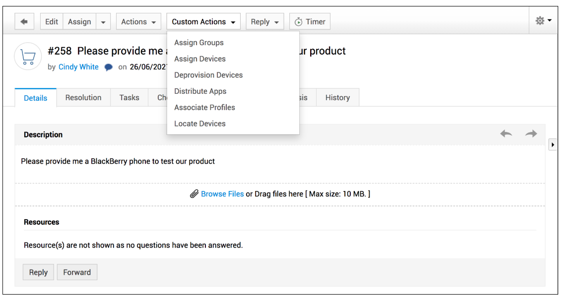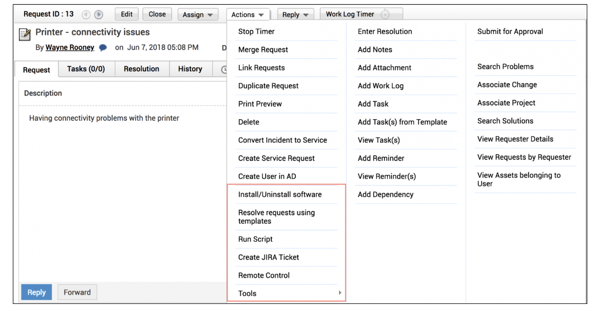 您还可以在服务请求模板的工作流程选项卡中的模板操作下启用Endpoint Central 操作。 您可以在请求详细信息页面的自定义操作菜单下触发所选操作,以便从 ServiceDesk Plus 执行常规桌面管理活动。