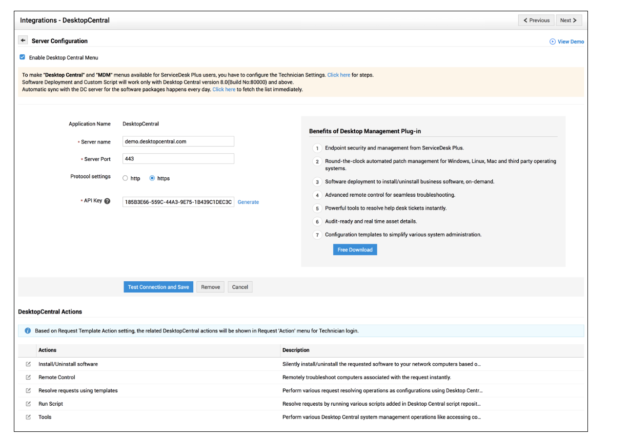 您可以将 Endpoint Central 与 ServiceDesk Plus 集成,自动执行常规桌面管理活动,如在网络中的 Windows 工作站和服务器上安装软件、补丁和服务包。 您还可以为用户或工作站执行脚本。