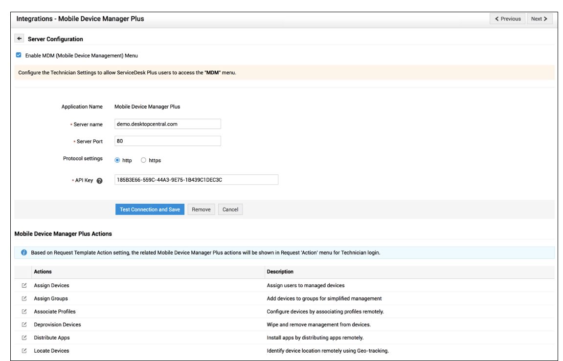 在 ServiceDesk Plus 中配置集成时,可以将 Mobile Device Manager Plus 操作与请求模板和角色相关联。