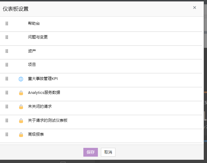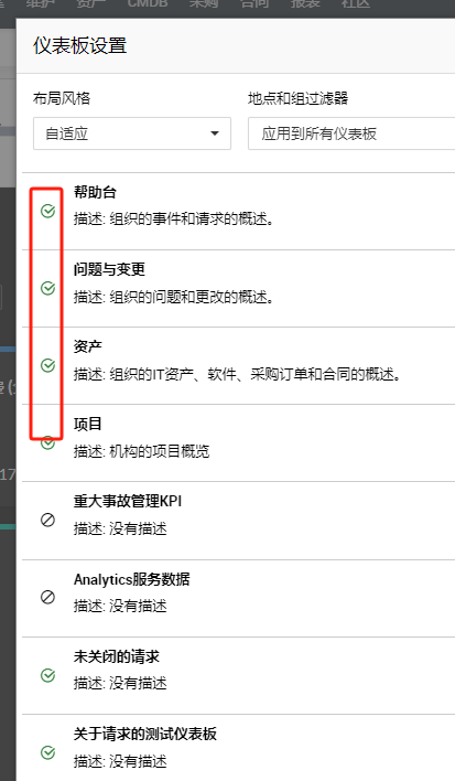 通过添加新的仪表盘、窗件和组织窗件,可以根据要求定制仪表盘主页。窗件可以在现有仪表盘(服务台、问题与变更、资产)或新添加的仪表盘下进行分组。