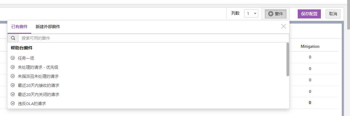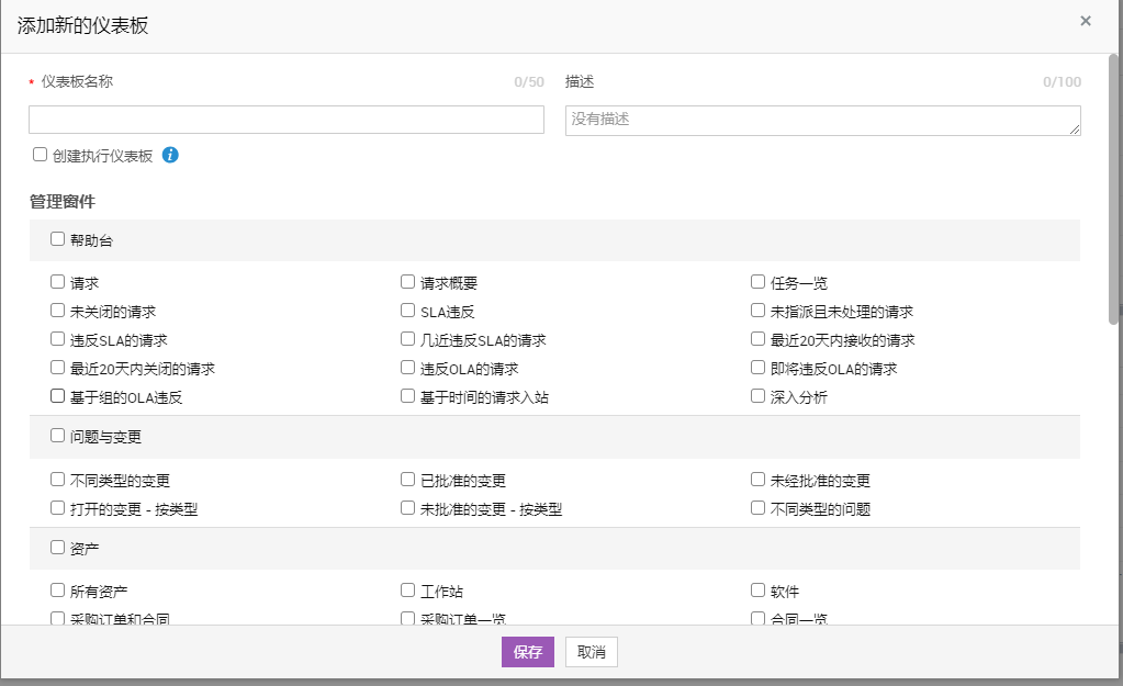 每个仪表板(服务台、问题与变更、资产)最多可添加 20 个窗件(包括默认窗件)。
