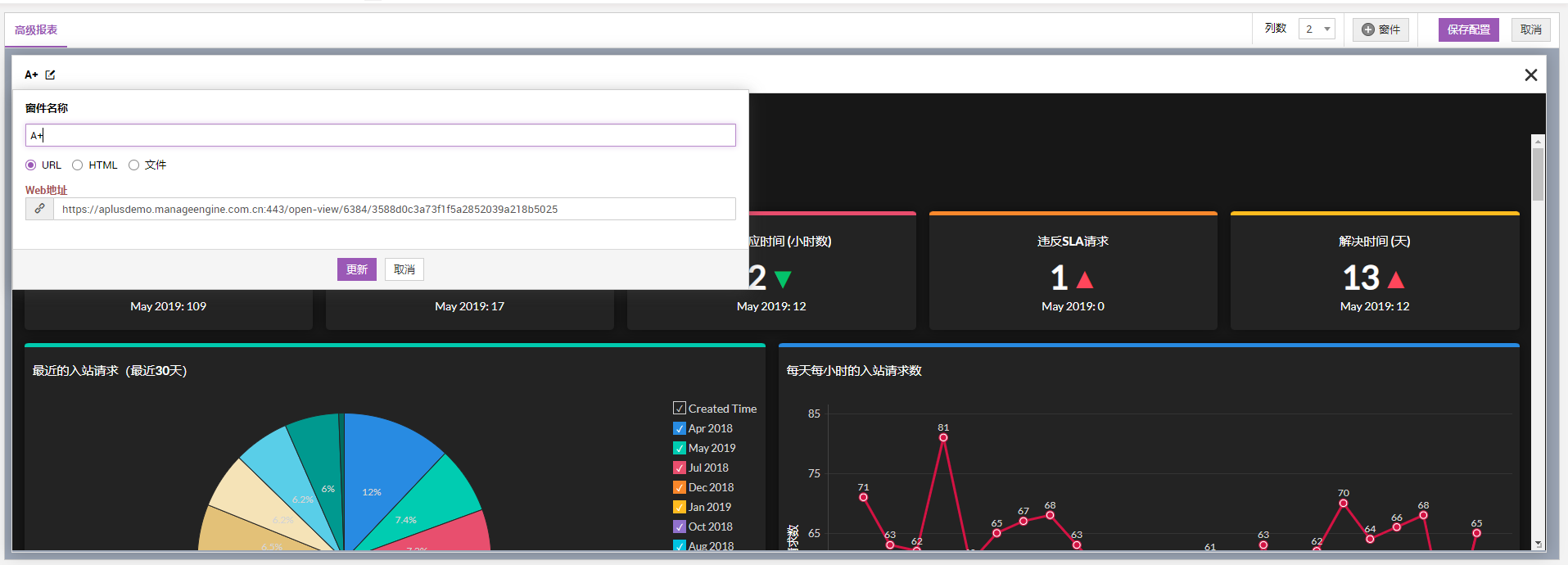 除了默认提供的仪表盘(如帮助台、问题与变更和资产),还可以根据需要添加新的仪表盘。例如,您可以创建一个仪表盘,在一个地方显示帮助台、问题与变更和资产的数据。报告摘要、按优先级排列的请求状态都可以在一个仪表板上显示。通过提供组织内网或其他资源页面的 URL,可以将该页面添加为仪表盘的外部窗件。